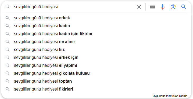 Tabii bu dönemde artışın başını yukarıdaki anahtar kelimeler çekse de, long-tail anahtar kelimelere de göz atmayı ihmal etmemeliyiz. Long-tail anahtar kelimeleri bulmanın paid-free birçok yolu var. En kolayı ise doğrudan Google’da arama yapıp auto-complete yöntemini kullanmak. Örnek vermek gerekirse aşağıda “sevgililer günü hediyesi” yazıp bir boşluk bıraktım. Burayı kullanarak anahtar kelime havuzunu genişletebilirsiniz.