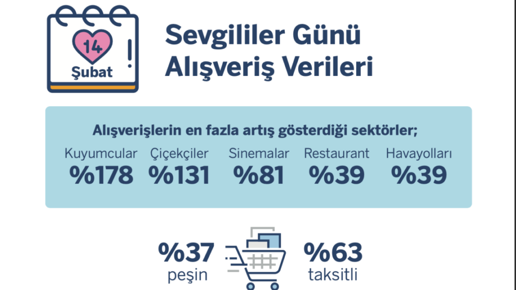 Garanti BBVA Ödeme Sistemleri (GÖSAŞ) verilerine göre; Sevgililer Günü alışveriş verilerine bakıldığında kuyumculuk, çiçekçilik, sinema, restaurant ve havayolları başta olmak üzere çoğu sektörde ciddi artışlar olduğu gözüküyor. Takı tarafının inanılmaz yükselişi dikkat çekiyor. 14 Şubat’ın çiftler tarafından nişan tarihi olarak seçilmesinin etkisi büyük.